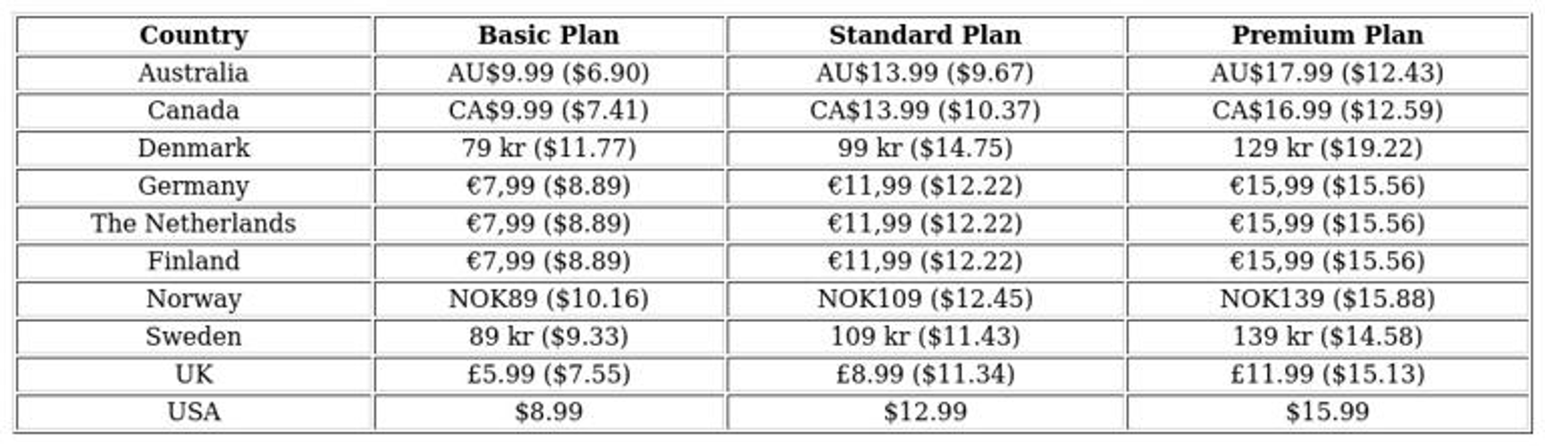 The UK has also experienced notable price hikes. Since its price increase in May 2019, the standard plan has risen over 50 percent—from $7.55 in 2012 to $11.34 in 2019. While the basic plan remained stable, the premium plan increased by more than a third since its 2013 introduction.