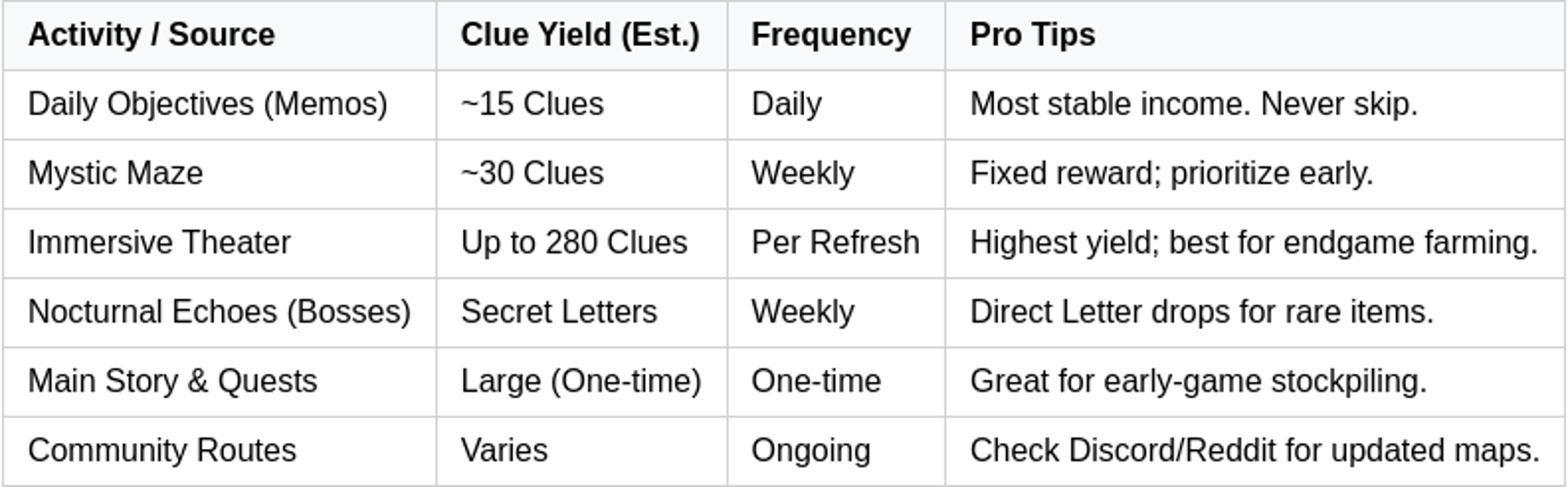 For endgame progression, prioritize immersive theater events, as they offer the highest clue-per-minute efficiency, making your grinding sessions more productive.